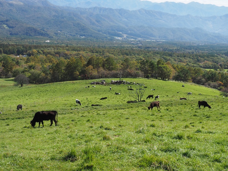 清里から見る富士山は美しく、大空の下で放牧された牛たちはそろそろ帰って行く時期ですね。振り返れば八ヶ岳が聳え立っています。