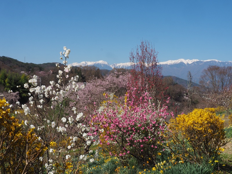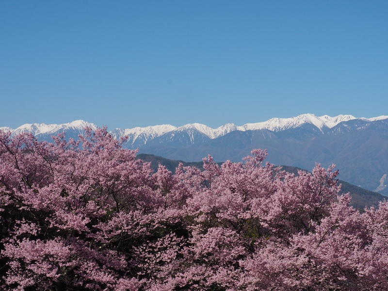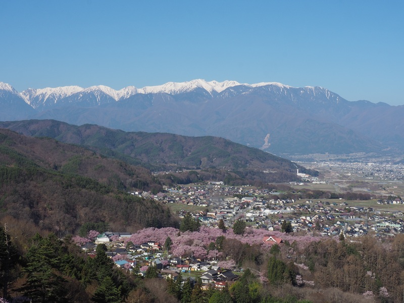 高遠のコヒガンザクラは残雪の中央アルプスと青空をバックに見事に映えています。眼下に見える人の込み合う城址公園を出ると、周りには静かでさらに美しい風景が待っています。是非歩いて欲しいものです。